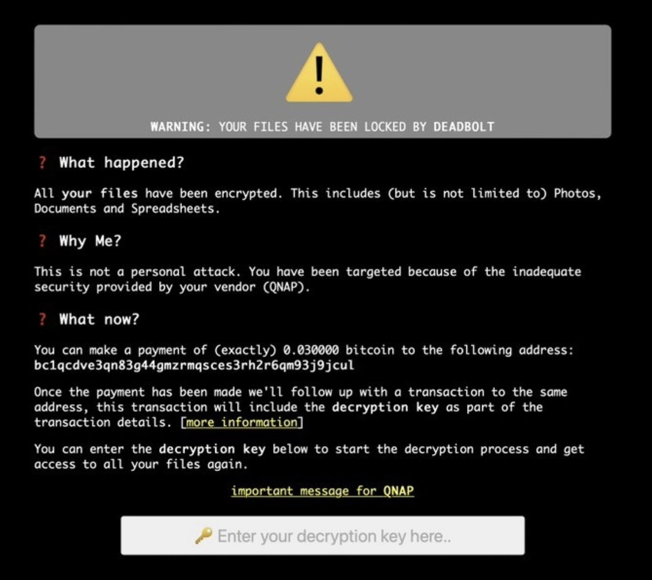 More than 4,000 QNAP devices have now been infected and locked by the new strain of ransomware known as Deadbolt. Once infected users will find their files are all encrypted and changed to a .deadbolt extension, and on logging into the device, are greeted with a ransom note.