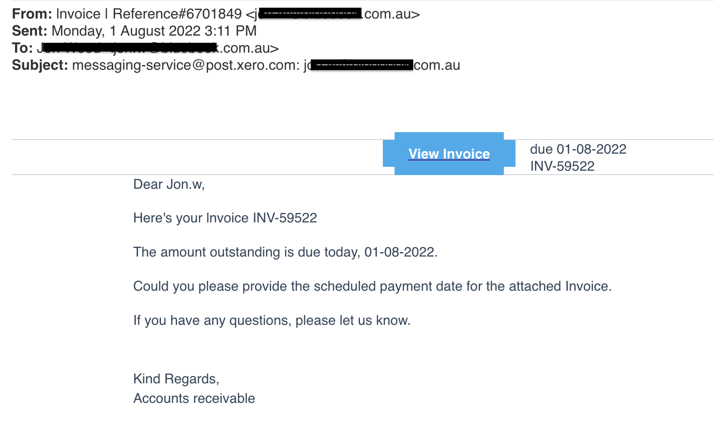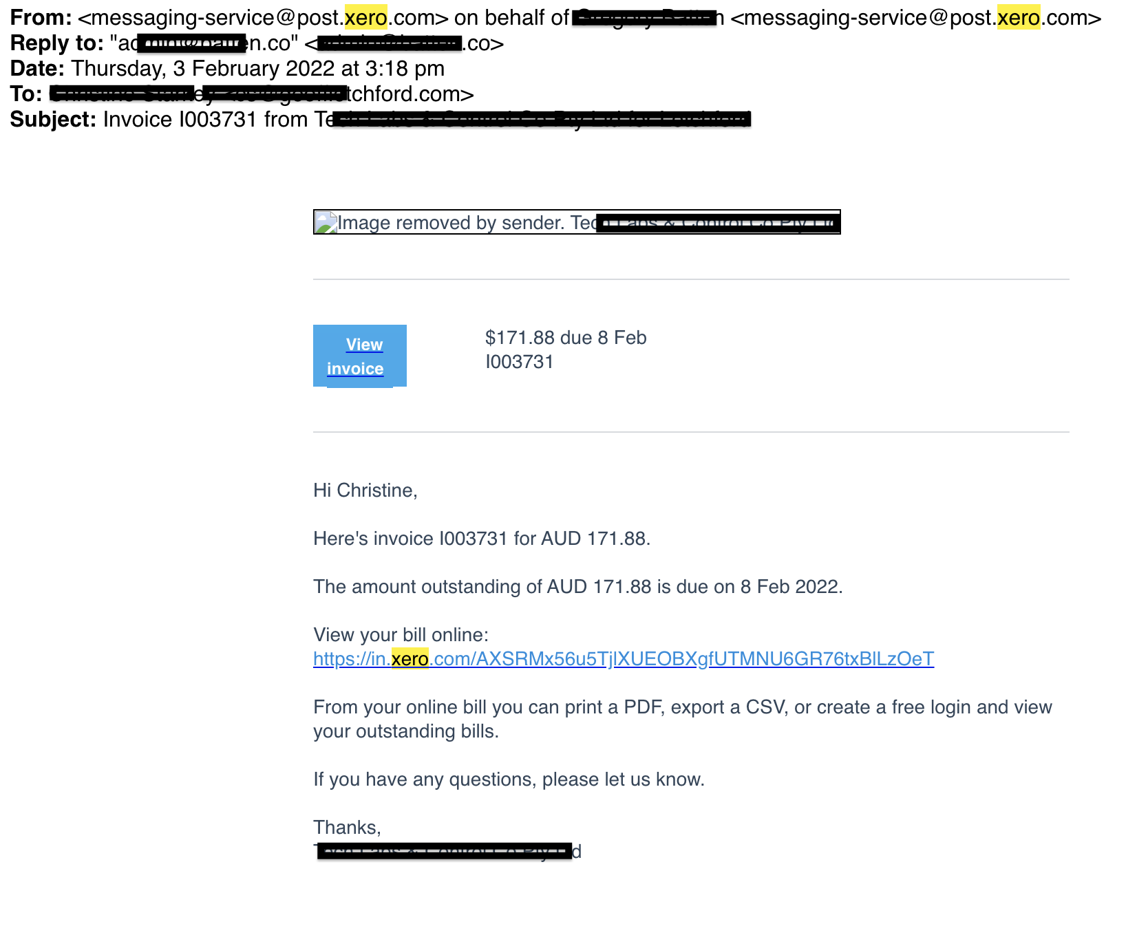 Notice they’ve used very similar words to what we are used to like “messaging-service@post.xero.com” which is the subject, not the email address, however I didn’t realise this until I looked further. The email address seems legitimate, it actually shows the recipient’s email address, so there is no suspect domain here to give it away. To work this one out I had to look at the source.
