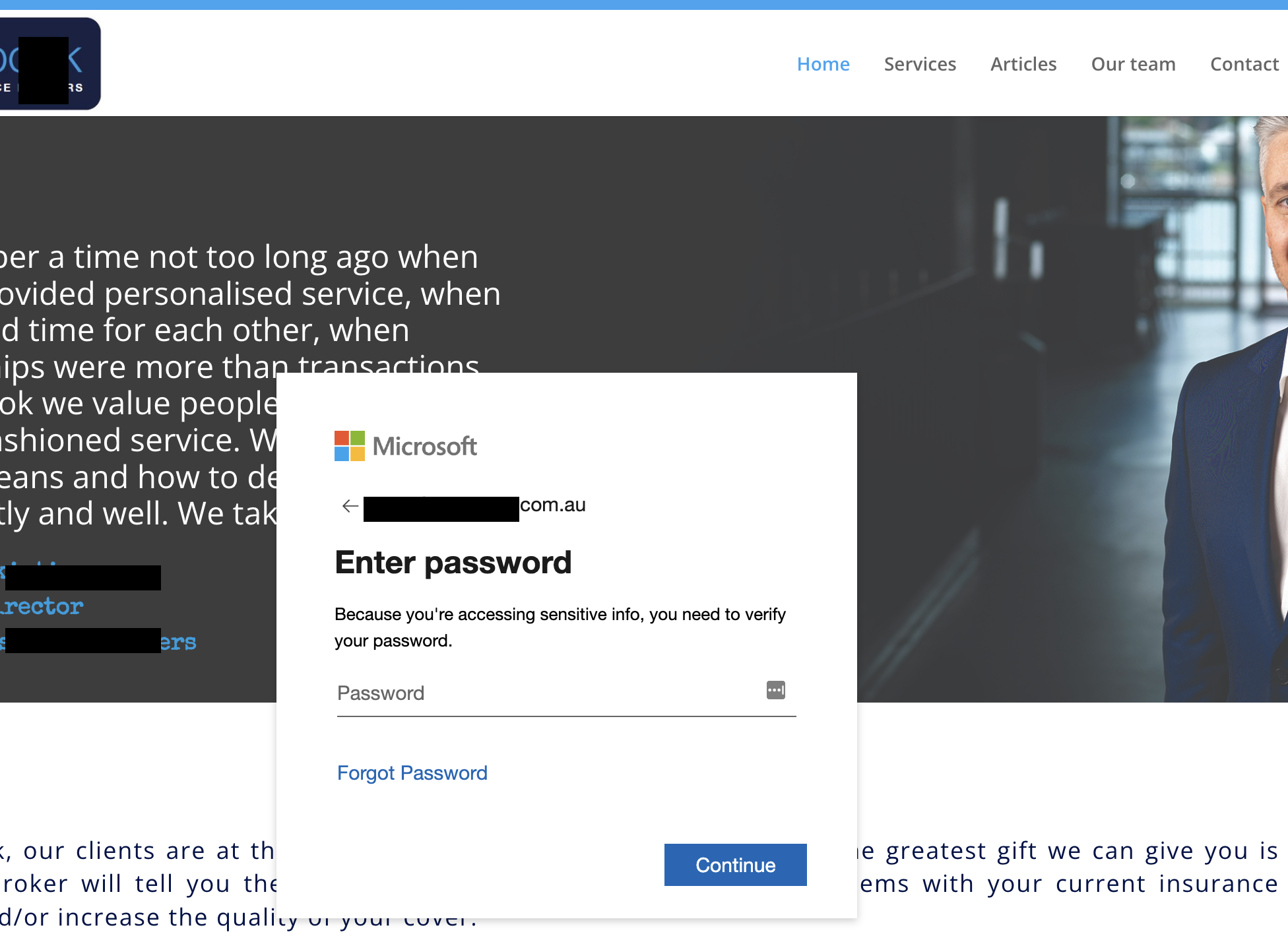 When we check the email in our lab we find the following. A page that has actually loaded the recipient’s website and a “Microsoft” login page. It’s obvious to us they are stealing Microsoft credentials.